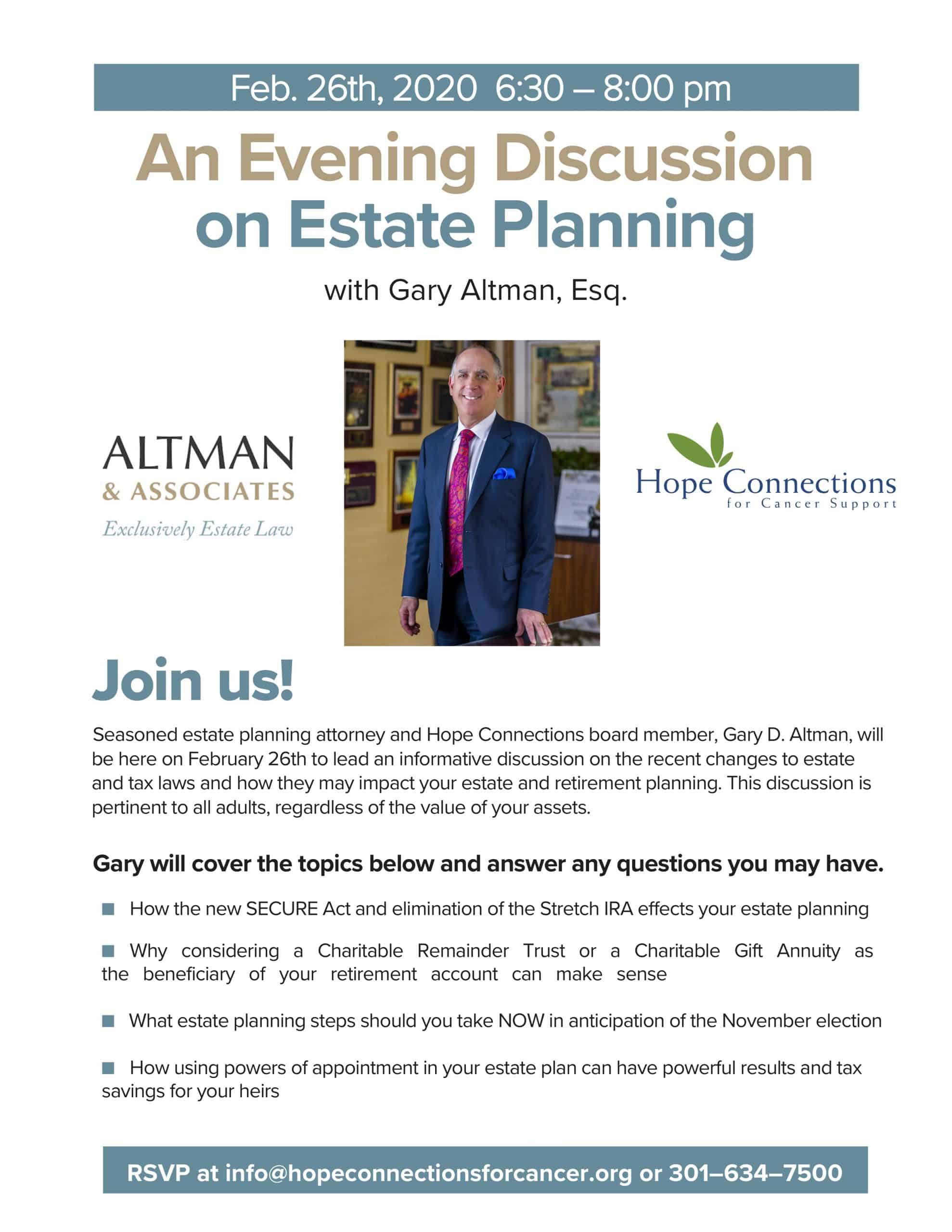 February 26, 2020 – Gary will be leading an informative discussion at Hope Connections for Cancer Support on the recent changes to estate and tax laws and how they may impact estate and retirement planning. More information here.