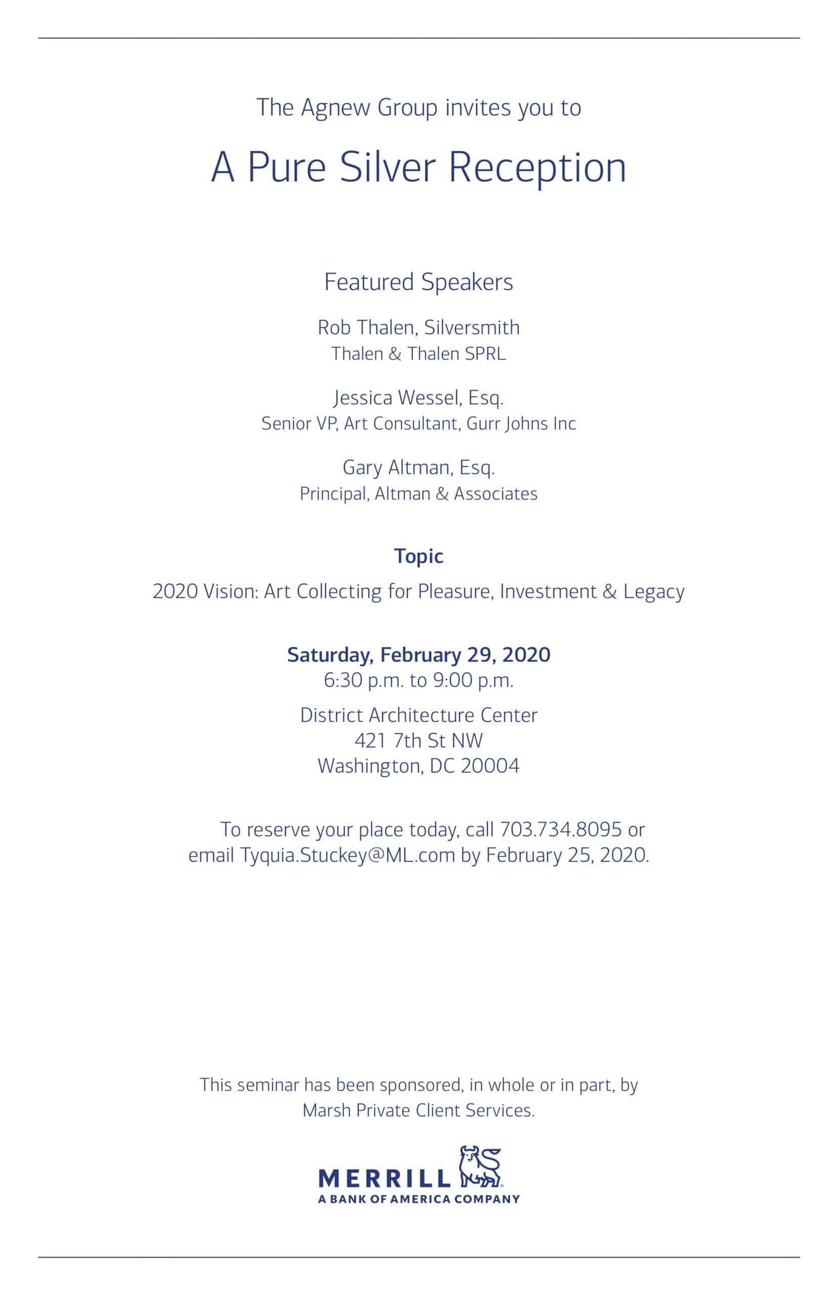 February 29. 2020 – Gary will be a guest speaker at “A Pure Silver Reception” – a seminar sponsored by the Agnew Group. The topic is 2020 Vision: Art Collecting for Pleasure, Investment & Legacy. The event will take place between 6:30 and 9:00 PM at the District Architecture Center in Washington, DC. To reserve your place, call 703.734.8095 or email Tyquia.Stuckey@ML.com by February 25, 2020. More information here.